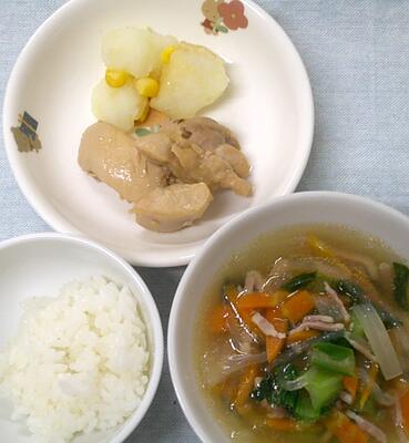 春雨の原料は、緑豆やじゃがいも、さつまいもの「でんぷん」です。今日の春雨スープはつるっと食べやすく、子ども達にも人気のメニューです。