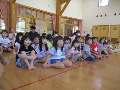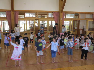大きいクラスのみんなで、運動会のおわりの会の練習をしました。