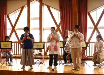 水をいれたペットボトルを使った演奏には我が園の先生も飛び入り参加で「ちゅうりっぷ」を演奏♬