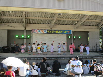 7月27日(日)キュリー祭のステージイベントに12名が参加してくれました。とても暑い中でしたが、「勇気100%」の曲に合わせて両手に持った鳴子を元気に響かせながら踊ってきましたよ♪
