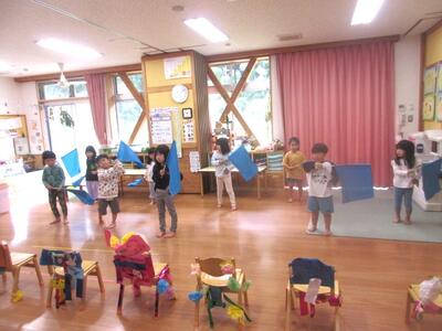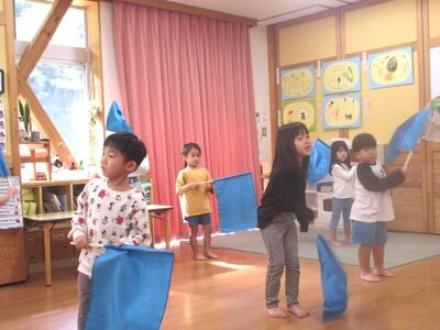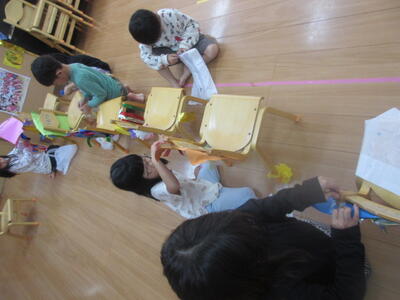 おうちの方の為にと飾りつけしていたイスで毎日過ごしていましたが、そろそろおしまいにしようか・・・ということになり、最後にまたみんなで運動会の時の旗をしました。