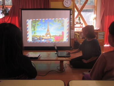 大きなスクリーンで映画のように見せて下さり「行ったことあるー!」「ここ知っとるー!」と一つ一つに反応して、楽しい時間でした。