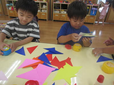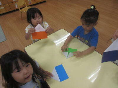 折り方を聞きながら「こーにぃ?」「あっとる?」と、先生や友達のと見合わせながら、一つ一つ折っていきました。