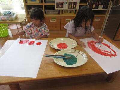 「でっかいきゅうりにしよ〜」「これは赤ちゃんトマト」など、お話も楽しみながら描きました。