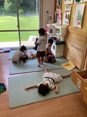体を動かして遊んだ後は、お部屋でゆっくりと過ごしています。