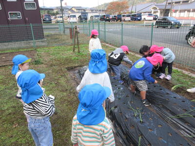 園庭に出ると、きりん組さんが玉ねぎの苗植えをしていました。「何してるのかな?」と見ているこあら組さんでした。