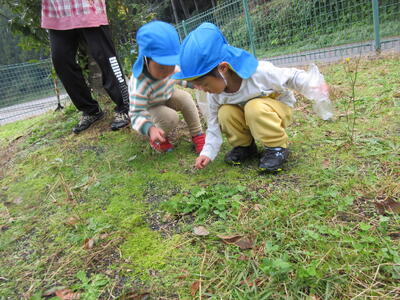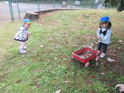 園庭ではドングリ拾いをしたり、葉っぱを見つけたりして秋見つけを楽しんでいました。