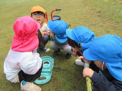 園庭で遊んでいると、ぱんだ組さんやきりん組さんと一緒に追いかけっこをしたり、カマキリを虫かごに入れて観察したりして自然と異年齢での関わりができていました。お兄さん、お姉さんと一緒に遊ぶのも楽しいですね。