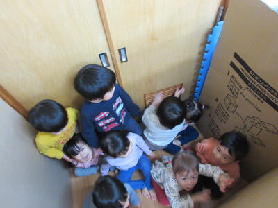 「せまーい」と言いながらも、小さくなって友達と一緒にダンボールの箱に入るのが嬉しそうでした。