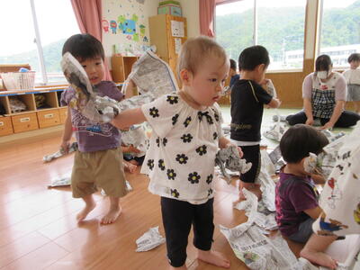 お部屋で新聞紙をビリビリ破ったり、丸めてボールにしたり、はたまた兜をかぶってはいチーズ!沢山楽しみました。
