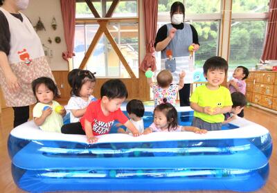 来週月曜日のプール開きに向けて、部屋からビニールプールに空気を入れて準備をしました。その後、ボールをたくさん中に入れてボールプールにして遊んでみましたよ!ビニールプールが膨らんでいく様子を不思議そうに見つめる子ども達。準備が整うと一斉にプールの中へと入り、大喜びで遊んでいましたよ♪