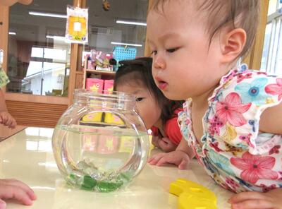 以前大きいクラスの部屋に遊びに行かせてもらった時に、部屋で飼育している金魚やカニなどの生き物に興味を示す友達が多かったので、りす組の部屋からも期間限定で、ナマズの“なーちゃん”“”まーちゃん”、タナゴちゃん家族を飼育することにしました。予想以上に子ども達は飼育ケースの中の生き物に釘付けです!
