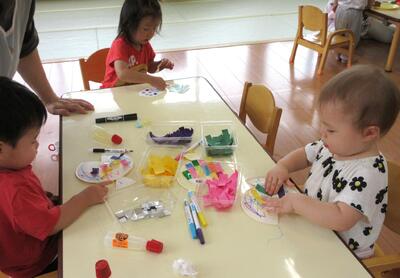 7月の製作で、2匹の魚をつくってみました!ペンで描いたりシールや紙テープを貼ったりしながら、ステキな魚たちが出来上がりましたよ。