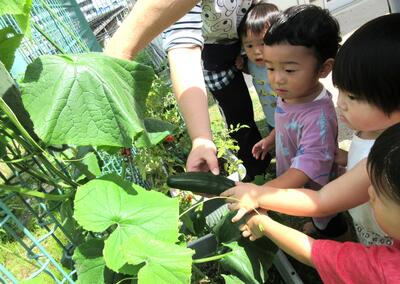 待ちに待った夏野菜の収穫の日!りす組のきゅうりとミニトマトもついに収穫を迎えることが出来ました!!