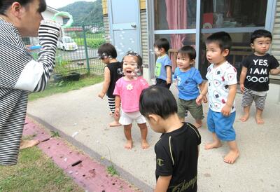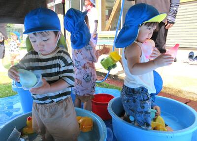 梅雨が明けてさらに暑さが増してきましたねー!あまりの暑さの為、健康面を考慮してプール遊びは中止しましたが、少しでも水に触れて楽しく過ごせればいいな・・・と思い、短時間ですが水遊びを楽しむことにしました。
