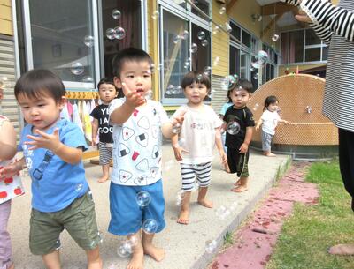 しゃぼん玉は初めて経験する友達もあったようで、「キャー!」と大喜びする姿、不思議そうに見つめる姿などなど様々でした。
