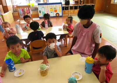 朝のおやつタイム。お兄さん効果大で、苦手な牛乳も頑張って飲めました!