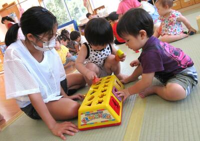 一昨日に続いて、今回は小学生ボランティアのお姉さんが来て下さいました。初めの間は、初対面のお姉さんをじーっと見つめるみんなでしたが、すぐに打ち解けて一緒に遊んでいましたよ♪