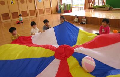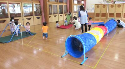 ホールですべり台やトンネル、鉄棒などを使ってたくさん体を動かしながら遊びました。時間が十分にあり、思う存分楽しむことができましたよ!途中からひよこ組さんも加わって、一緒に遊びました。