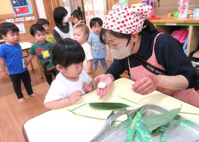 4、5歳児さんが地域の方々とちまきづくりをする様子を見に行ってみようと、みんながウキウキで向かったのですが・・・いざ、きりん組さんの部屋へ着くと初めて会う地域の方々に人見知りをしてしまう友達が多く、離れた場所からそーっと眺めるりすさんでした。雰囲気だけは、何となく味わえたかな?
