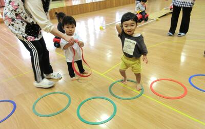 保育者の真似をして、ラバーリングでケンケンパ!グニュグニュして感触を楽しむ姿も・・・