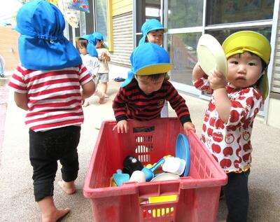 部屋からしばらく遊んだ後に、短時間ですが中庭に出て遊ぶことにしました。時間と共に汗ばむ陽気になり、タライに少しだけ水を溜めてみました!するとすぐに興味を示して次々と集まり、嬉しそうに遊ぶ子ども達でした♪