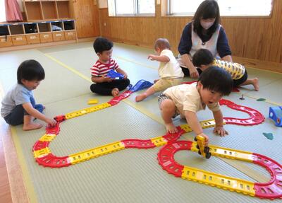 プラレールの玩具が目新しくて、夢中でミニカーを走らせてます!