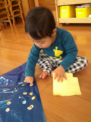 今日は製作遊びをしました。お花紙を両手でくしゅくしゅくしゅ・・・
