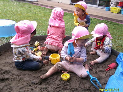テラスでも園庭でも砂場は大人気!園庭の砂はさらさらしており、感触の違いを感じる子もいましたよ。