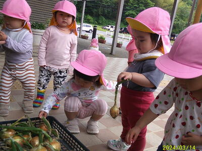 今日は園庭に行きました。玄関を出ると、昨日収穫された玉ねぎを発見!!