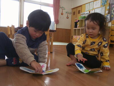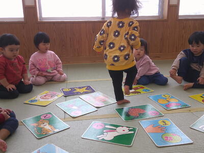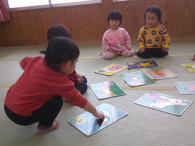 保育者が言うカードをじっくり見ながら探します・・・