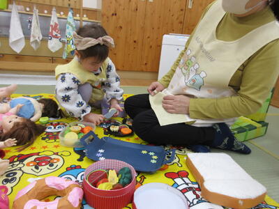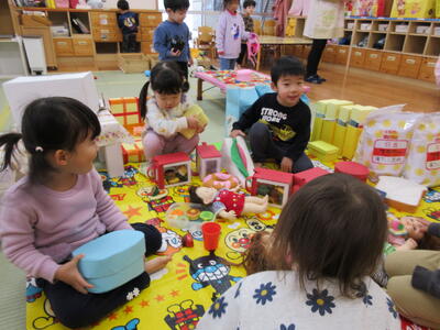 今日はお部屋でままごと遊びをしました。シートを敷くと、ピクニック気分でたくさんのごちそうを並べたり、人形を寝かしてあげたりして楽しんでいました。キッチンセットや発表会で使った小道具でのお料理作りも楽しそうでしたよ。友達と「これどうぞ」「ありがと」と言葉のやり取りも弾んでいました。部屋に紐を通すと、洗濯ごっこも始まります。お部屋でゆっくり過ごすのも楽しいですね。