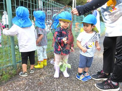 こあら組以上の4クラスが、芋掘りをしていて、収穫したてのさつま芋を触らせてもらいました!