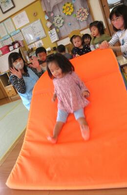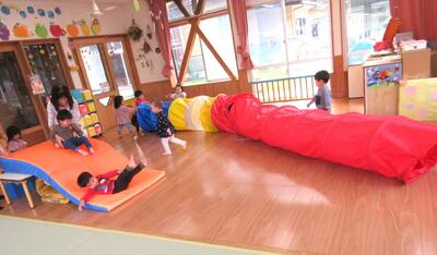 傾斜マットを台に載せてすべり台にしたり、マットをトンネルにしたり、トンネル2本を繋げて長ーいトンネルにしたり…普段と遊び方を変えてみると子ども達にとって新鮮だったようで、大盛り上がりでした!