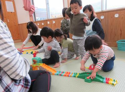 ひよこ組さんと一緒にホールでいろいろな運動遊びを楽しみました!