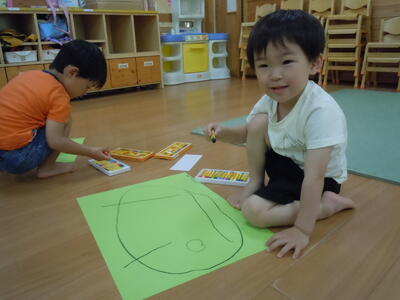 5月の絵をかきました。自分のクレパスを用意して、楽しそうにかいていました。