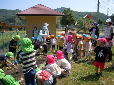 途中、4・5歳児がさつま芋の苗植えをしてくれたので見学しました。秋にはみんなでお芋ほりです。