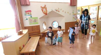 絵本袋を持ったら、友達や保育者と一緒に手を繋いで絵本コーナーへ