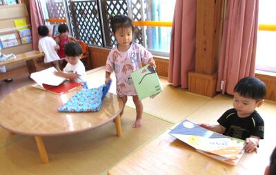 毎週木曜日は絵本貸し出しの日ということで、プール遊びを終えてから絵本を借りました。初めの頃は、保育者が部屋に絵本を持って来て、そこから自分で絵本を選んでいましたが、最近は大きいクラス同様に実際に絵本コーナーに行って借りています。