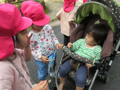 横手方面に「カニさんがいるよ。」と聞き、お散歩に出かけてきました。ぱんだ組の友達もいて「おーい」「カニさんおらんよ~」など、報告してくれました。カニさんは見つけられなかったけど、帰り道にかたつむりをみつけましたが、バギーの中では気持ちよく眠りにつく子ども達でした。園に帰りかたつむりを観察、不思議そうに見ていましたよ。