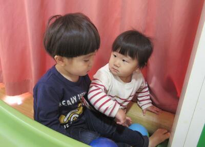 りす組さんと一緒にホールで遊びました。りす組さんに圧倒されながらも自分たちのしてみたい事を探して遊んでました。