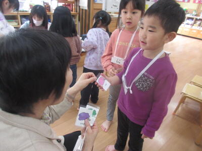 絵本を借りに行く時には「はしらんよー」「みんなでいこうで」と声をかけ合いながら並んで歩く姿を見ても、進級が近付いているのが伝わってきます。