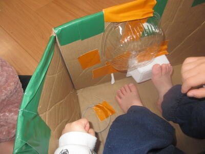 段ボールで自分達が入れるほどの大きな車をつくっているのですが、今日は「マフラーもつけようで」と、見ているとトイレットペーパーの芯をマフラーに見立てて車体の後ろに付けていました。