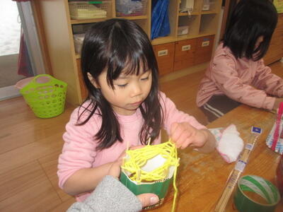 牛乳パックでの編み物も「やってみたい!」と、集中したこの表情。