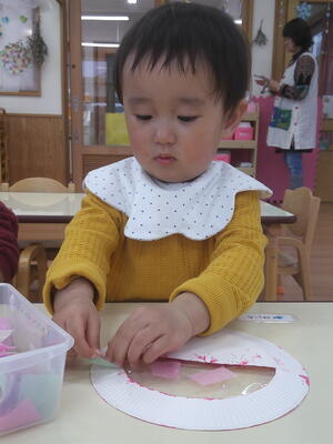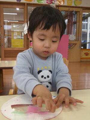 製作遊びで、両面テープ剥がしをしました。