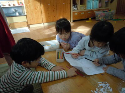「なあなあ、先生の顔かこうよ。先生の顔かくひとこのゆびとまれ~♪」何やらひそひそ楽しそうでした。