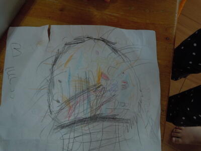 「できた~!みて~。わははははは~!!」どうやらかわいくかいたわけではなさそうです。