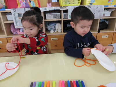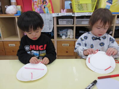 切り込みに毛糸を通すのは少し難しかったですが、保育者と一緒にしたり、「次はここ~!」と、どこに毛糸を通そうか自分で考えたりしながら、毛糸を通していました。可愛い雪だるまができましたよ。