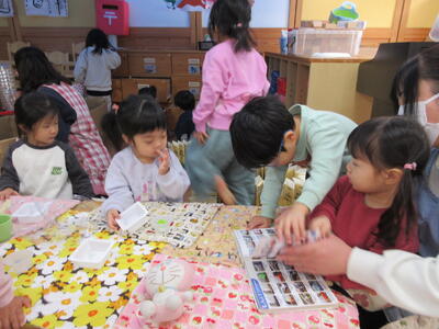 画用紙の冠を糊で貼ったり、おひなさまの顔をペンで描いたりしました。糊を使う際は、指先に糊をチョンと付けたり、画用紙に指で糊を伸ばしたりして、使い方が上手になってきましたよ。