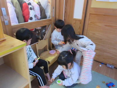 ドングリや松ぼっくりを使ってままごとをしたり、机に布を広げてコタツにしたりと、いつもとは違う遊び方をぱんださんが教えてくれて、一緒に楽しんでいました。